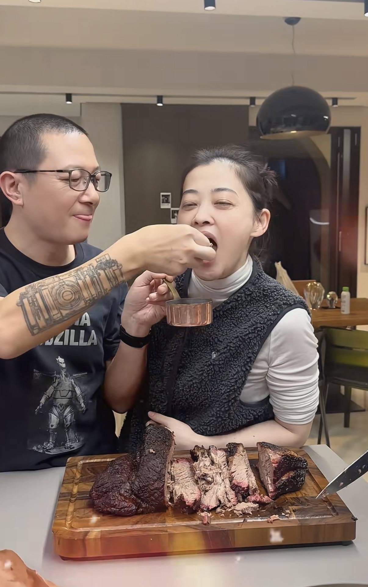 “德华”刘琳还起哄让他们秀恩爱,曾剑把切好的酱肉喂给梅婷吃。梅婷搂着老公的手臂,笑起来像个小女孩一样羞涩。夫妻俩感情真好,是那种真实不油腻的恩爱。